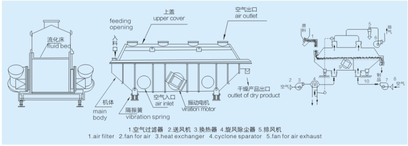 目前应用广泛的卧式振动流化床干燥机,形状和基本结构与普通卧式流化床干燥机很相似。区别在于振动流化床整个机体通过弹簧支撑在底座上,多孔板稍向出料端倾斜,机体一侧或两侧装有振动电机。物料依靠机械振动和穿孔气流双重作用流化,并在振动作用下向前运动。物料自进料口进入机内,在振动力作用下,物料沿水平方向抛掷向前连续运动,热风向上穿过流化床同湿物料换热后,湿空气经旋风分离器除尘后由排风口排出;干燥物料由排料口排出。